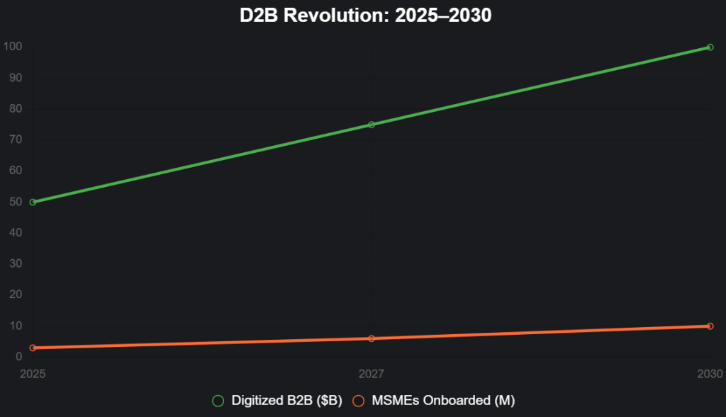By 2030: $100B digitized B2B, 50 million jobs, 40% cost savings. The truth: D2B isn’t the next D2C—it’s the next ONDC.