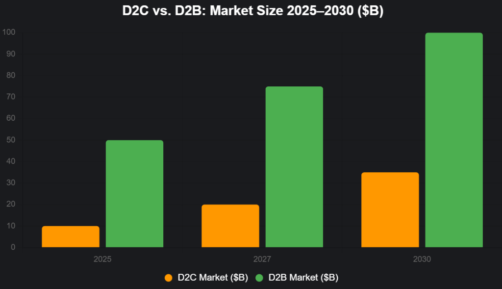 D2C exploded—$10B market (2025), 1,000+ brands, 30% CAGR—but D2B is deeper: