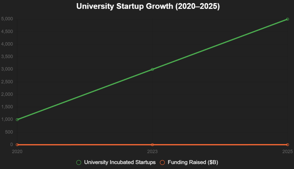 1,000 incubators, 15K ventures, $5B raised. Universities aren’t engines—they’re ecosystems. Ignite the innovation.