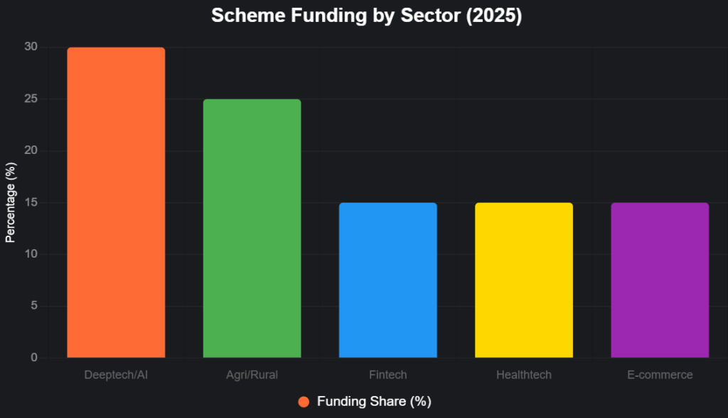 DPIIT’s Rs 945 crore pot doles Rs 20-50L grants via 300+ incubators for PoC/market trials. 2025 focus: Deeptech and women-led, with 209 already funded. Apply via incubators—turnaround: 45 days.