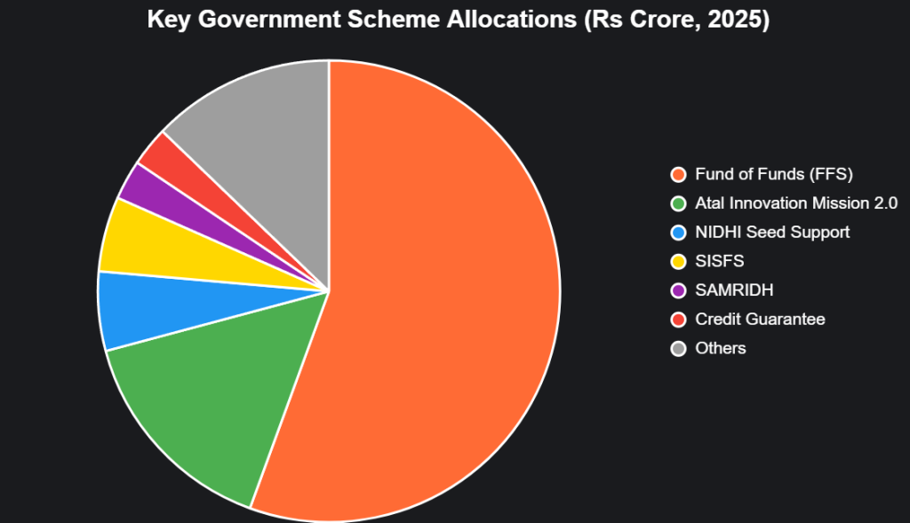 India’s startup funding rebounded 20% to $12 billion in 2024, with H1 2025 already at $7.7 billion. Government schemes captured 15% of that, prioritizing deeptech, women-led, and Tier-2 ventures. Atal Innovation Mission 2.0’s Rs 2,750 crore infusion and NIDHI’s seed blitz signal a shift: from survival to scale. This pie chart breaks down scheme allocations: